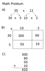 So why don’t I like the method of mathematics presented in the video? Let’s look at the steps the students are being asked to do when answering, 35 x 12. In the first step the students break the numbers down into their components 35 = 30 + 5 while 12 = 10 +2. Students then plug the numbers into a grid and multiplication is done by multiply the rows by the columns. The multiplication produces four numbers which are added to get the final answer.